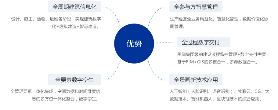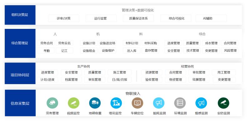 依托于中交建智慧工地平台建设优势,形成“一个云平台,N个应用”的产品优势,全面提供智慧工地整体解决方案,通过物联平台完成工地现场数据的收集、共享、统计、分析,完成智慧工地现场的现场监控、流程管理、决策分析等全部功能。同时为后续经验数据使用提供基础。