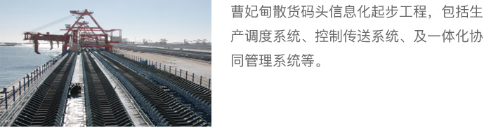 曹妃甸散货码头信息化起步工程,包括生产调度系统、控制传送系统、及一体化协同管理系统等。