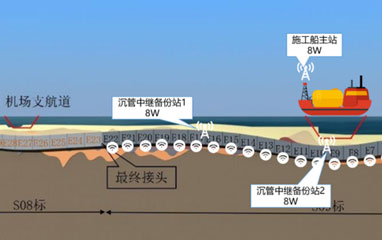 通过建设无线局域专网构建施工作业船与西岛、沉管间的无线通路。在施工作业船和沉管内上架设无线自组网基站后可让周边的WIFI手机、IP对讲机接入进无线局域专网内,在无线局域专网内的手机、IP对讲机可实现语音呼叫、对话等功能,实现施工作业船与沉管的语音通信。